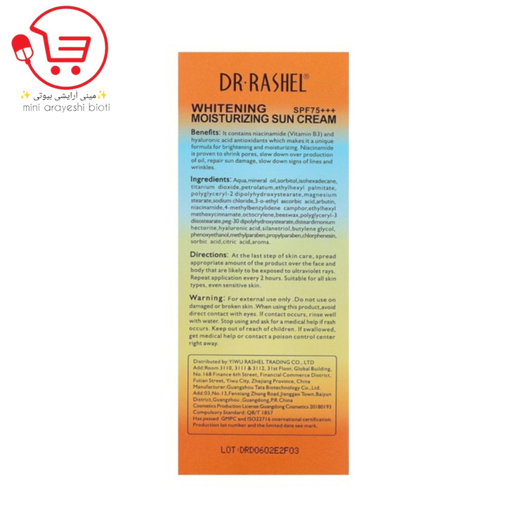 ضد آفتاب بدون رنگ دکتر راشل ساخت کشور چین است که مانند ضد آفتاب Hydrate وزنی 60 گرمی دارد و حاوی SPF 75 می باشد.